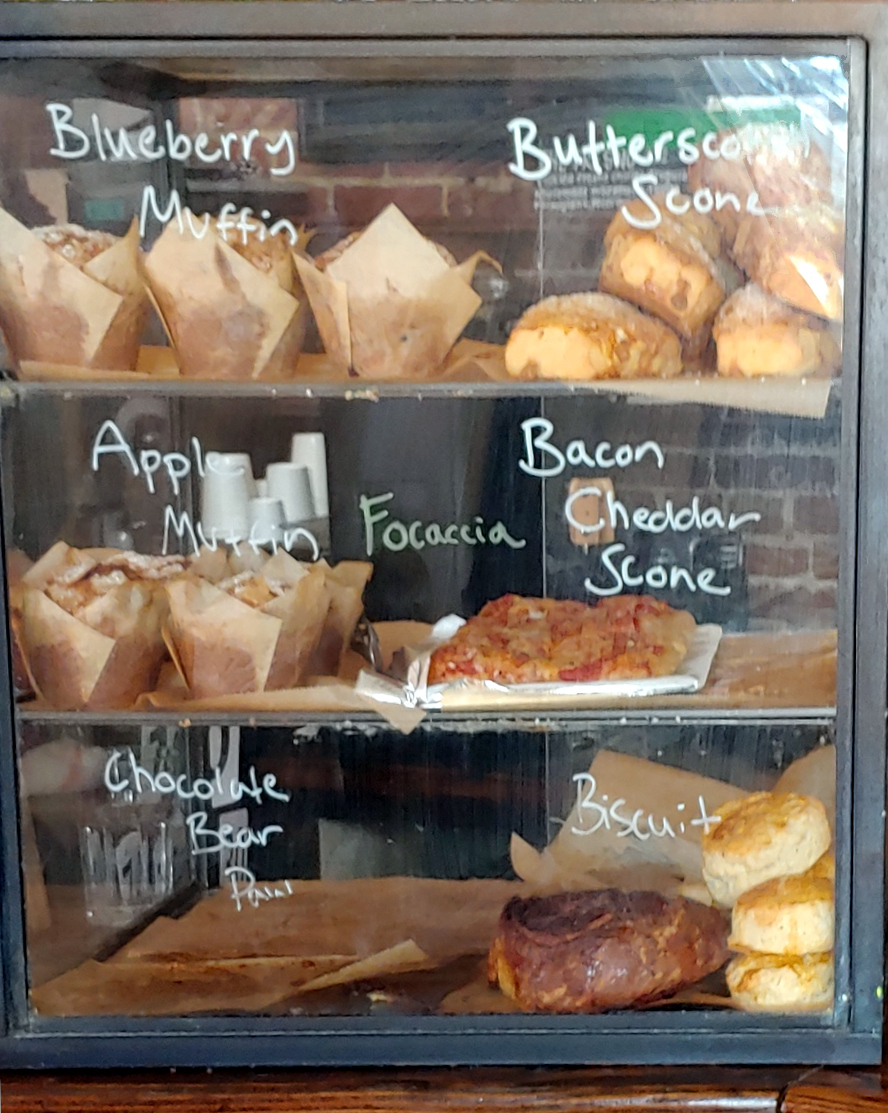 The baked goods include scones, muffins, biscuits, and Focaccia. Too full to try one on my first visit, I made sure to have one on my next. There are two kinds of scone available — a Butterscotch Scone and a Bacon Cheddar Scone — and both enticed me. But there is one item in the case that I could not resist: the Chocolate Bear Paw.