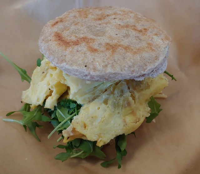 On another trip, I had the Breakfast Sandwich. It is an egg sandwich, which by default is made with an English muffin. It turns out that it can also be made with a bagel. I decided to stick with the English Muffin. In addition to the egg, the sandwich has caramelized onions, aged cheddar, and arugula. The muffin is whole wheat and is house made. Because of the whole wheat, it is flatter than a typical English muffin, but it is not dense. The texture is quite hardy, which I like. Both the cheddar and the arugula have a strong, sharp taste, giving the sandwich a lot of flavor. The onions serve as a sauce, providing some liquid to an otherwise dry sandwich. It is a great sandwich and I would get it again.