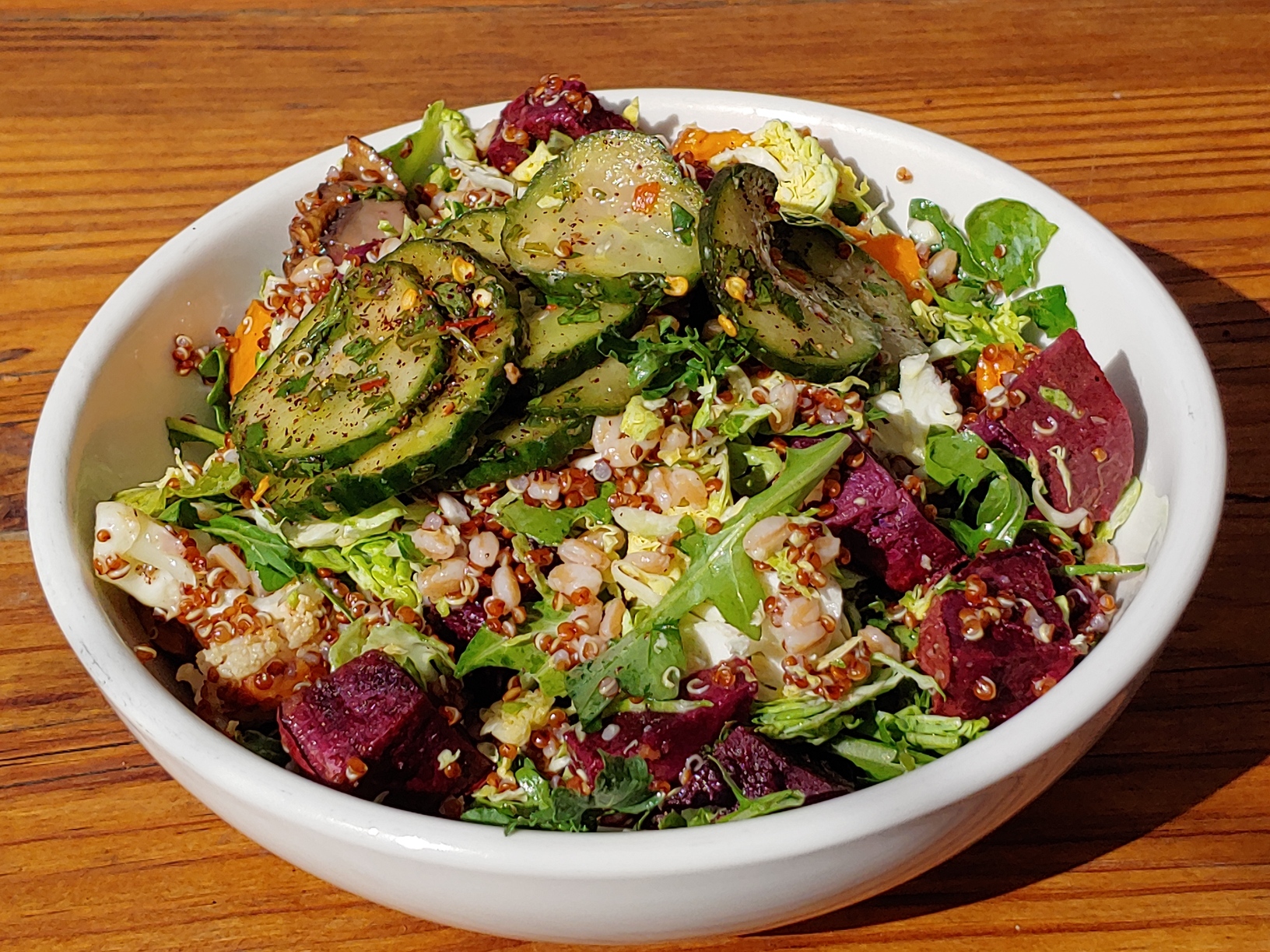On my first visit, I was not too hungry as I had eaten bagels and donuts while cheering at the marathon. Desiring something light, I chose the Farro Veggie Bowl. It is a grain bowl with the dominant grain being farro, although there is also some quinoa (the only protein in the dish).