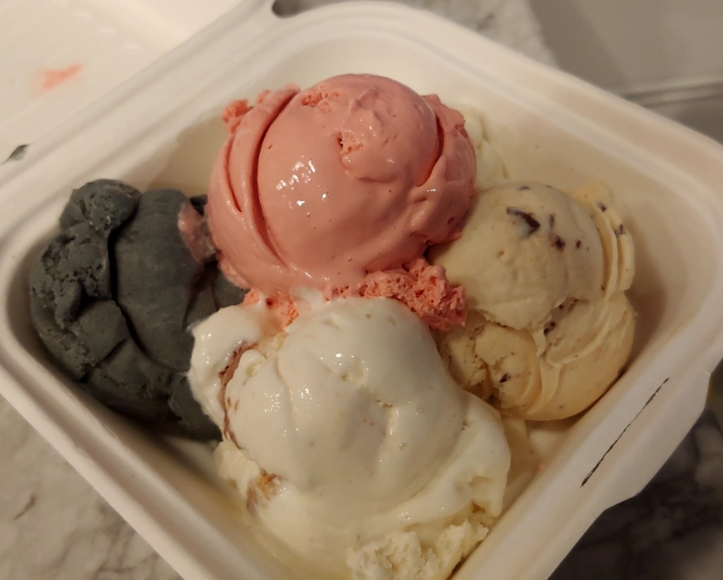 Ice cream comes in cups and cones, shakes, or sundaes. There are 10 flavors of Artisan Sundaes, with names such as Blue Table Chocolate Trio, Wee Bite of Scotland, and The North Park (an historic theater in Buffalo). There are also ice cream flights of either 5 or 9 scoops. My companion and I got a 5 scoop flight.