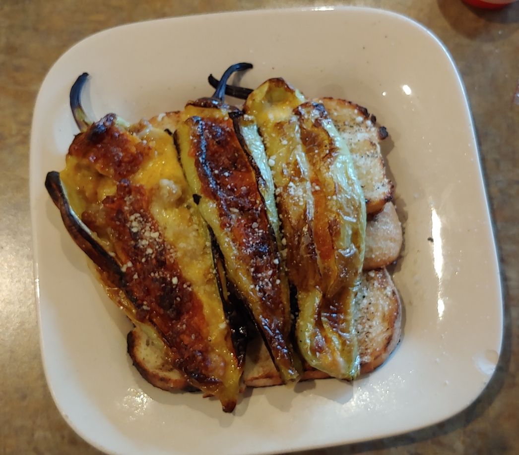 I have also ordered one of their sides: the stuffed hot peppers. They consist of long banana peppers stuffed with cheese and sausage. There is not a lot of sausage but there is a copious amount of cheese. And the peppers are spicy. The dish is served on thick slices of toasted Italian bread, making it quite hearty. My companion prefers his peppers to have more substantial stuffing, but I found the cheese stuffed peppers delicious. I also recommended this dish.