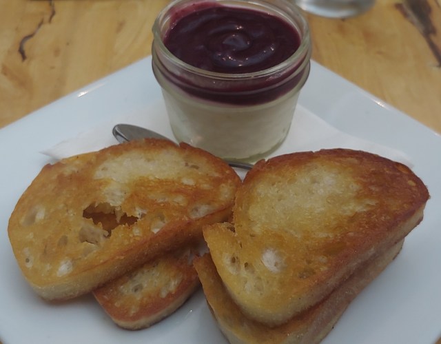 But we did not get the Deviled Eggs. We had the Blue Cheese Mousse. It consisted of a whipped cheese spread topped with a berry jam and served with toast. The menu did not specify what berry the jam was made with. It was on the tart side, which I liked. The blue cheese was very mild tasting, smooth and creamy. I found the tart berry offset the rich cheese quite well. Spread on top of toast, it was a great appetizer.