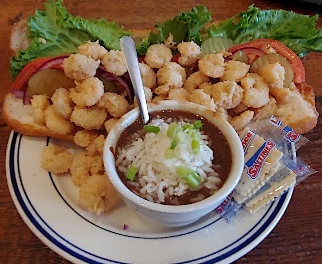 That is a lot to choose from. I decided I was in the mood for a Po-Boy and ordered that. The choices of meat are fried shrimp, fish, or crawfish. I went with shrimp. I also wanted to try the gumbo, so I ordered a cup of that. The Po-Boy was huge! It overflowed with shrimp, and the slice of French bread it was served in was enormous! The toppings were lettuce, tomatoes, and onions. None of the ingredients were skimpy and all of them were quite fresh. My one complaint was that I could have used a sauce. Maybe they forgot? Despite that, the sandwich was delicious.