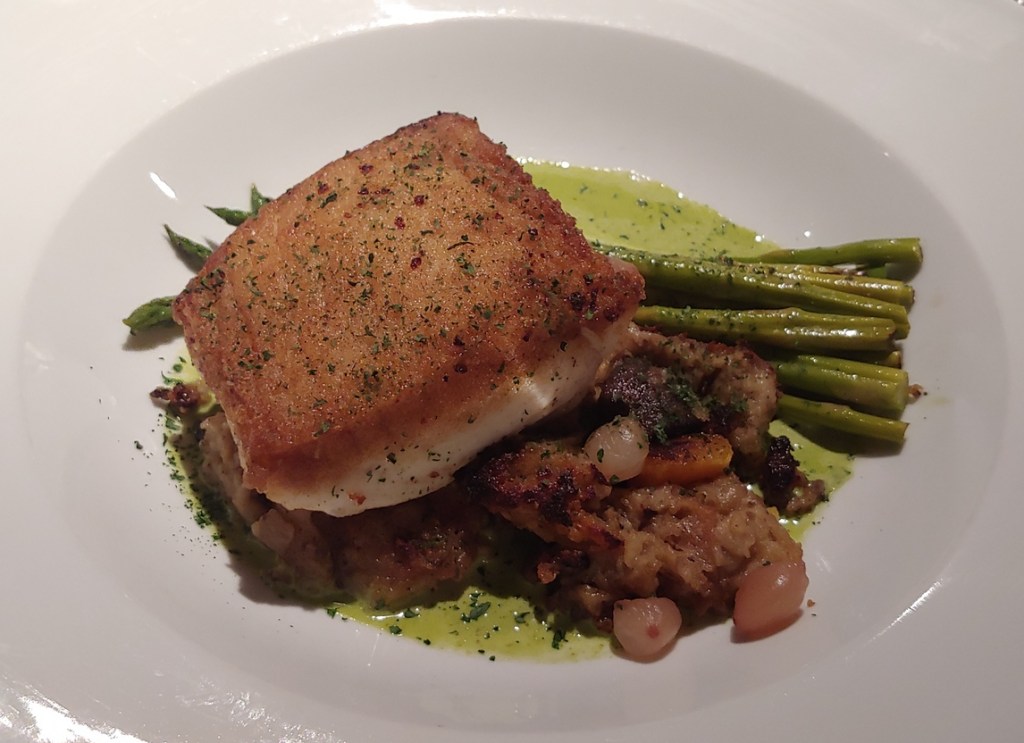 The entrees were: Lamb Chops, Panko Crusted Fresh Fish, 8 oz Beef Filet, 8 oz Hanger Steak, Roasted Eggplant, Duck Breast, Line Caught Fish, and Pan Seared Salmon. My companion had the Duck Breast, while I had the Line Caught fish. Most entrees are served with a choice of side, a potato (Noja Potatoes or Fingerling Potatoes) and vegetable (Brussel Sprouts or the vegetable of the day). The Line Caught Fish comes with fixed sides: asparagus and a mushroom based dressing,. The duck breast looked absolutely amazing, cooked to a perfect medium rare. My companion was very happy with it. The Line Caught Fish had a nicely crisped top and was tender and flaky. Unfortunately, I don’t remember what the waiter said the fish was. It was served with a silky green sauce that was amazing. It had a deep, rich flavor that the fish soaked up. I also loved the stuffing. It had a taste and texture that was out of this world.