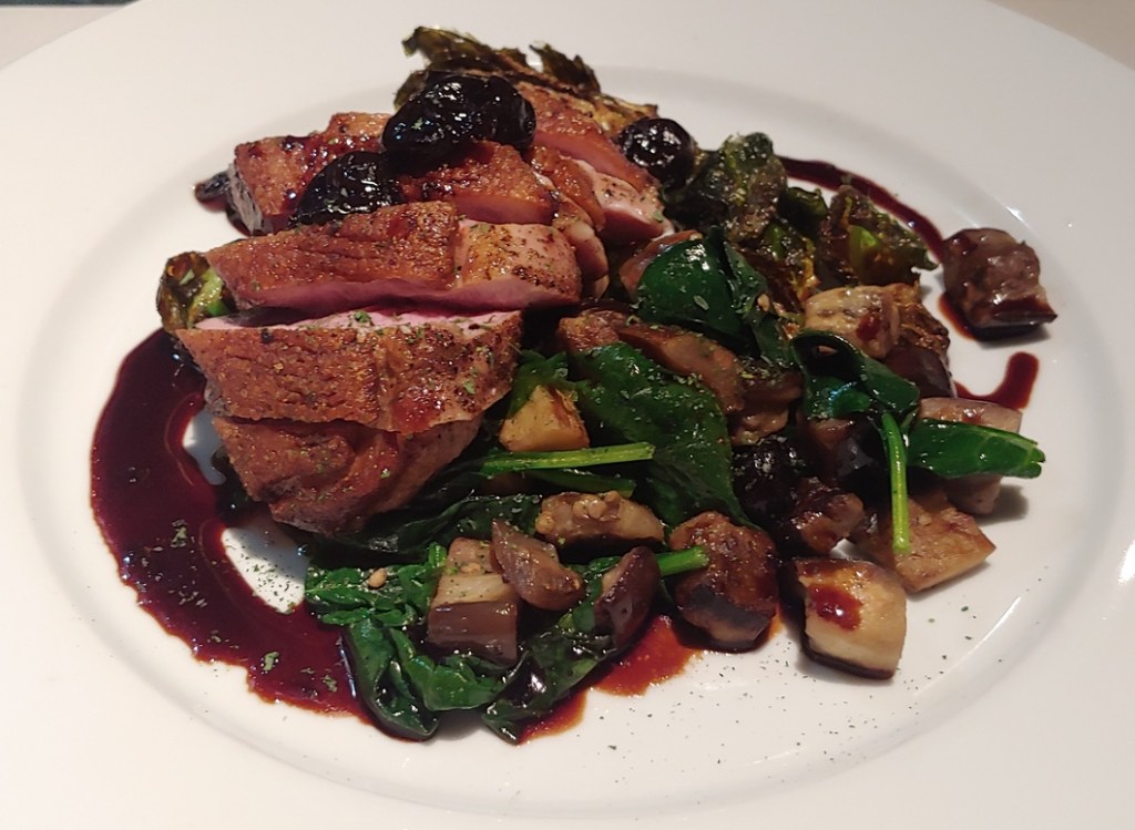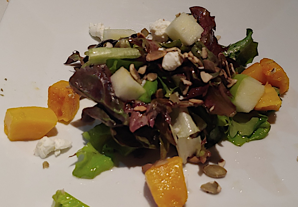 There were three choices of salad: Fall Salad, Spinach Salad, Caesar Salad. My companion had the Fall Salad while I had the Spinach Salad. The spinach salad had copious amounts of fresh baby spinach and was covered in a thick bacon sauce. It also had plenty of blue cheese crumbles; the blue cheese was quite strong. It’s a great mix of flavors, but a much heavier dish than I anticipated. The Fall Salad had a tasty mix of autumn ingredients. The highlights are roasted pumpkin and sliced apples. Pumpkins seeds provided a crunch. The dressing was an orange vinaigrette. My companion quite enjoyed it.