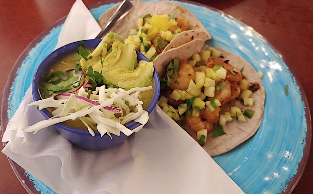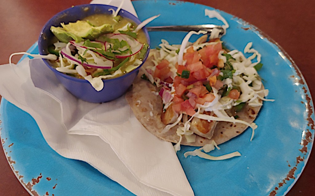 Both my companion and I were interested in the fish tacos. My friend had the Mahi Mahi while I had the Gulf Shrimp. We were both interested in one of the specials, Verde Chicken Pazole, and we both ordered a cup. Pazole is a hominy based soup. Thick and creamy, it was quite good.