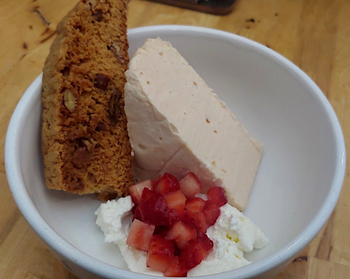 Even though I was not very hungry, I decided to take a look at the dessert menu. Choices were Persimmon Cheesecake, Tres Leches Cake, Strawberry Semifreddo, and a Meyer Lemon Tiramisu. The semifreddo seemed like it would be light, and I ordered that, My companions had the Tres Leches and the Tiramisu.