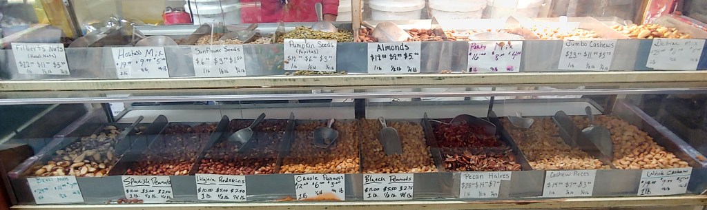 You can smell fresh roasted nuts as soon as walk in the door. In immediate view is a display case containing over a dozen different kinds of nuts. The varieties include: Hazelnuts, Brazil Nuts, Almonds, Pecans, Cashews, and several different kinds of peanuts (Blanch, Spanish, Virginia Redskins, and Creole). There are also nuts mixes, Sunflower Seeds, and Pumpkin Seeds. Sold by the pound, I bought a ¼ lb of two: the Jumbo Cashews and the Creole Peanuts. Freshly roasted, the cashews were fabulous. I shared some with a friend who normally does not like cashews and he loved them. The Creole Peanuts were not as fresh and did not leave a strong impression on me. They had a little bit of a kick, but they were also very salty.