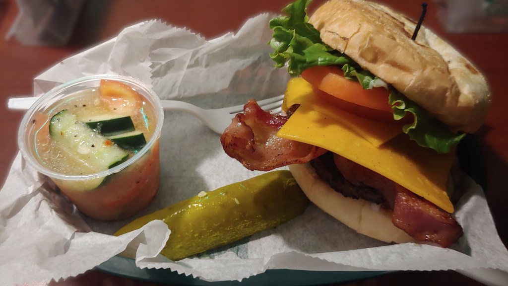 The Hellfire Bomb, made with habanero peppers, is extremely hot. Her second order was the Ban-Mi Smash. It is a burger made with Wagyu beef but in a steamed bun. The toppings include American Cheese, carrots, Daikon, and jalapenos. She said it was excellent, but I’ve forgotten her detailed comments.