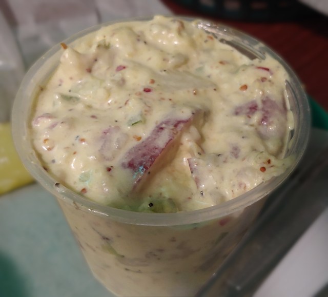 For my side I picked the tomato-cucumber salad. The cucumbers were nice and crisp. The tomatoes were so so, but I expect that out of season. They were in a tangy vinaigrette. Other sides ordered at the table were Cole slaw and potato salad for the other. Both got good reviews.