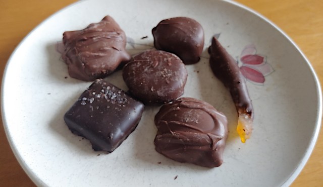 My pick was: candied oranges, meltaways, caramels, pillows, turtles, and mint cremes. I was not familiar with meltaways and asked what they were. They are a chocolate candy with a soft, almost air like texture. Pillows are similar to a chocolate covered marshmallow. Mine was stuffed with peanut butter. Everything was excellent. At $35/pound, this candy is not cheap. But worth it. And I did not spend too much. The sample I had — half of which is shown in the picture — was $5.