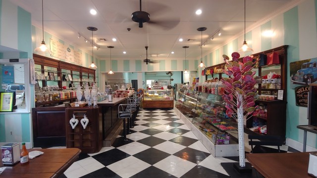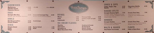 Three Georges serves more than just candy. They have savory items such as Sandwiches (including Muffuletta! ), Hot Dogs, Gumbo, and Jambalaya. On the sweet side of things, there are 8 flavors of iced cream, Banana Splits, Sundaes, Shakes, and Floats.