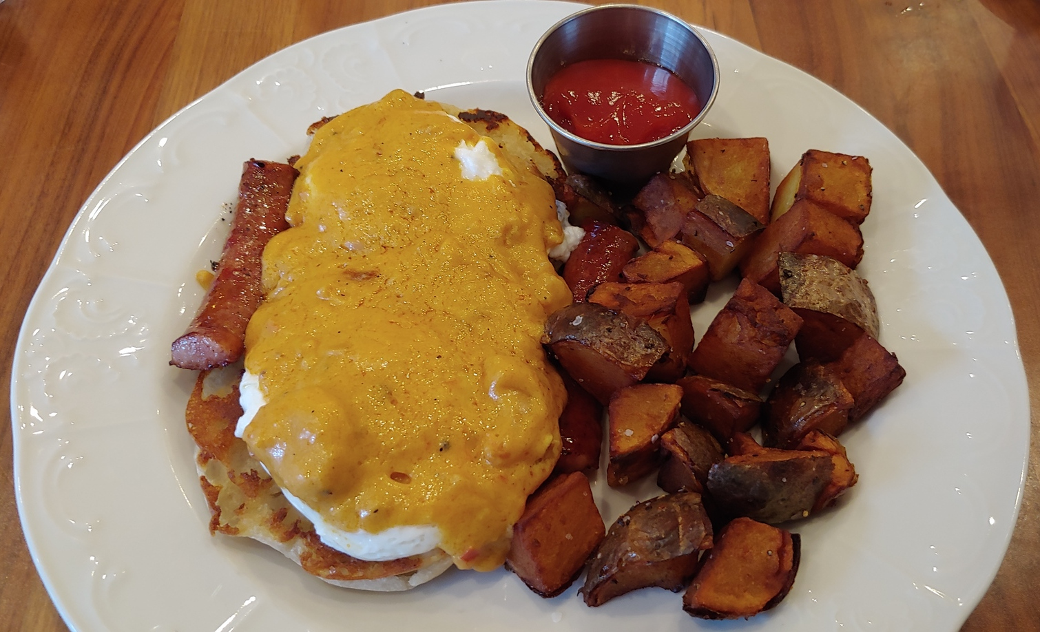 I found the selection quite daunting, as so many of the items sound good. And while I do love a good Poutine, I decided to go with one of the Benedicts: the a la Joe Cain. It is also named after a historic Mobile figure, as Joe was the person who started the modern celebration of Mardi Gras in the period following the Civil War.  A la Joe Cain is similar to a traditional Benedict, except that it has Conecuh sausage instead of bacon and a crawfish cream sauce instead of hollandaise. The Conecuh sausage is a type of sausage that is not found outside of Mobile, The waitress remarked that Conecuh was one of the things she missed while she was living outside of Alabama. And I can see why. The sausage is a bit spicy, but what gives it a unique flavor is that it is hickory smoked. I liked the rest of the Benedict as well. The eggs were freely running and the English muffin had good texture. The home fries were crisp and fresh.