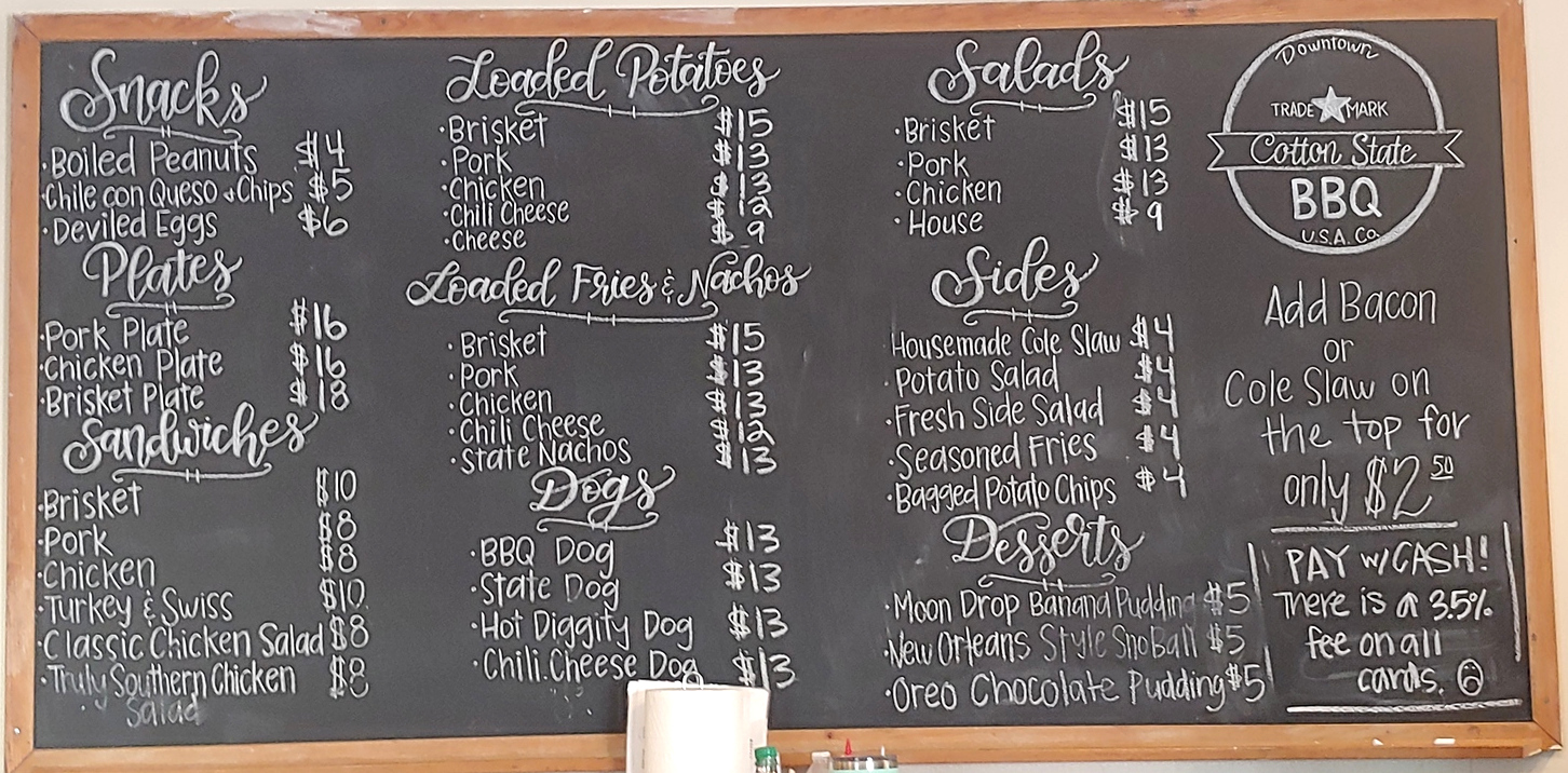 Cotton State BBQ chalkboard menu: Snacks, Plates, Sandwiches, Loaded Potatoes, Loaded Fries, Dogs, Salads, Sides, Desserts.