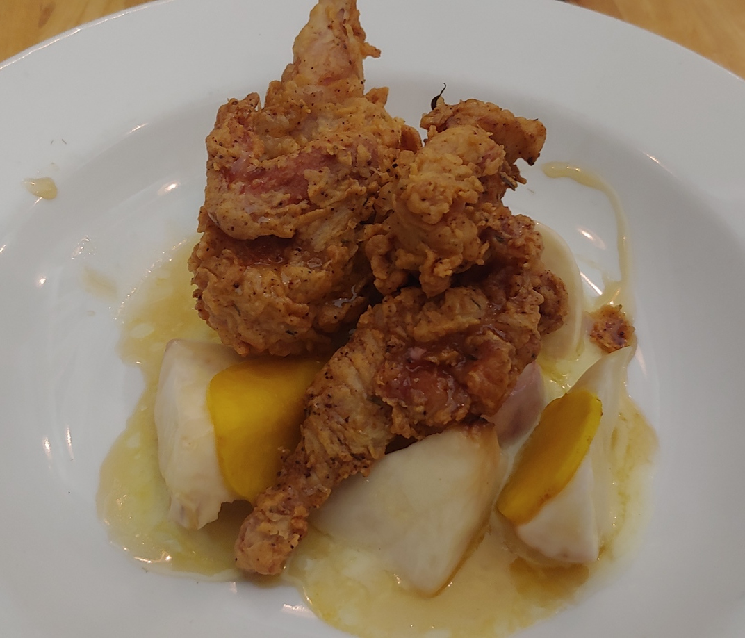 I was not too hungry that evening, so I ordered a Small Plates item for my main meal. The choices were: Fried Quail, Chesapeake Bay Scallops, Dixie Lee Peas, and Lion’s Maine Mushroom. As much as I love scallops, I can get Chesapeake Bay scallops any time in Maryland. So, I had the Fried Quail. Since quail is a smallish bird, it was portioned just right for me. The preparation was perfect: crispy on the outside and juicy on the inside. It was succulent!