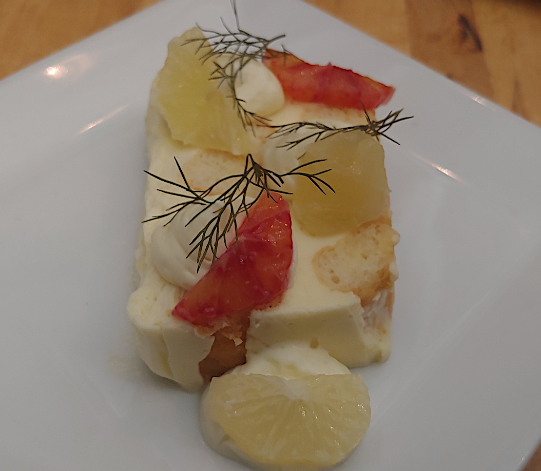 Even though I was not very hungry, I decided to take a look at the dessert menu. Choices were Persimmon Cheesecake, Tres Leches Cake, Strawberry Semifreddo, and a Meyer Lemon Tiramisu. The semifreddo seemed like it would be light, and I ordered that, My companions had the Tres Leches and the Tiramisu.