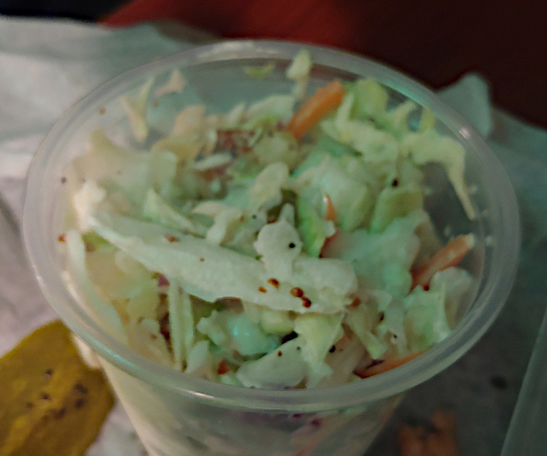 My companions and I all chose the pork sandwiches. But we had different sides. I had cole slaw while my friends had fries. I was expecting the pork to be pulled pork, but it turned out to be sliced! It has a great, smokey flavor that was absolutely delicious. Cotton State has a couple of bottles of red or vinegar BBQ sauce at the table, but this pork was so good that it did not need any. The cole slaw was vinegar based and not mayo. It was seasoned with paprika, giving in a unique flavor. I liked it a lot and felt it went well with the pork.