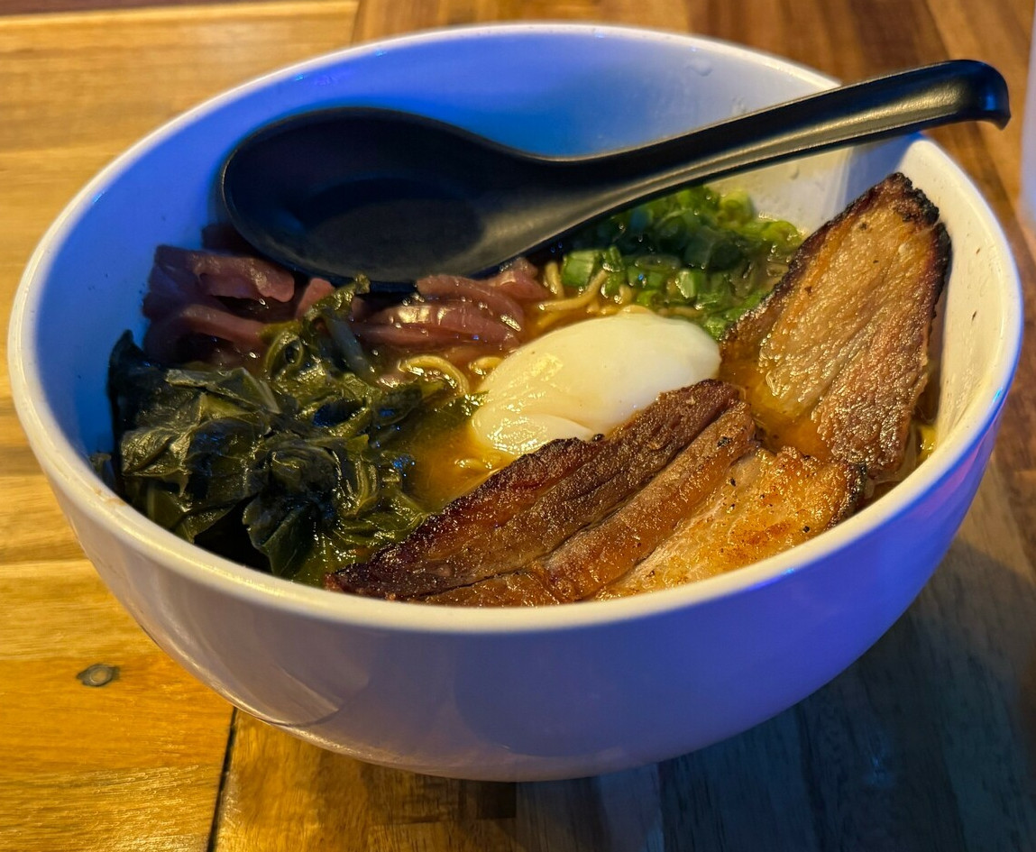 For her meal, my friend ordered two items. The first was the Slurp OG Ramen bowl with a cup of Hellfire Bomb. The OG is an almost traditional bowl of Ramen, but has a southern twist: Collard Greens and Roast Pork Belly. My friend was impressed with the pork, remarking that it was tender but also had good texture. In her experience, that is uncommon in ramen.