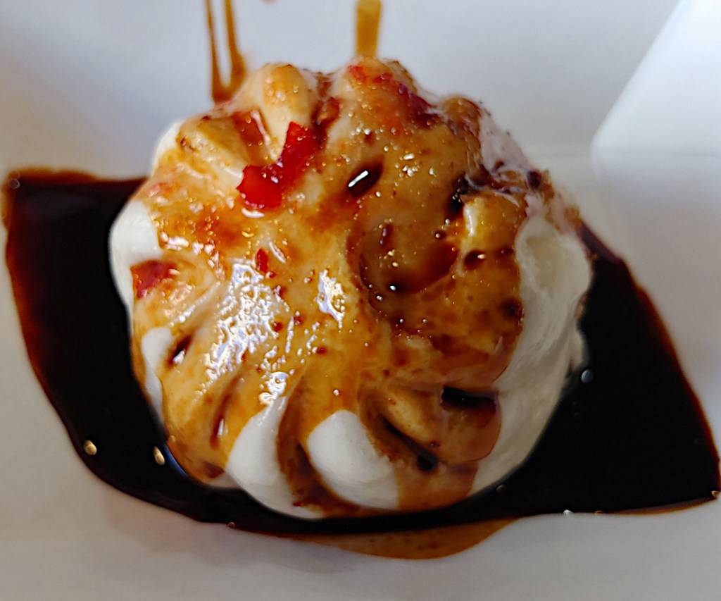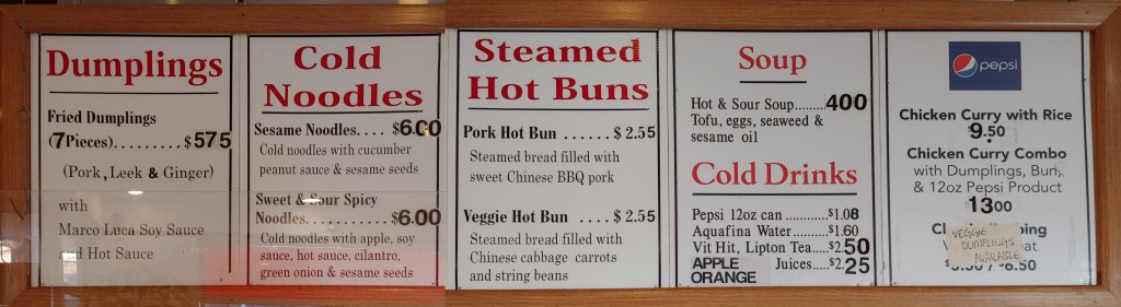 Marco & Luca’s menu is small and straightforward. The main items are Dumplings, Cold Noodles, and Steamed Hot Buns. They also have Hot & Sour Soup and Chicken Curry with Rice. Canned soda is available for drinks. The dumplings are fried and made with pork and onions (leeks). There are two types of noodles: Sesame or Sweet & Sour Spicy. Likewise, the steamed buns come in two varieties: pork or veggie.