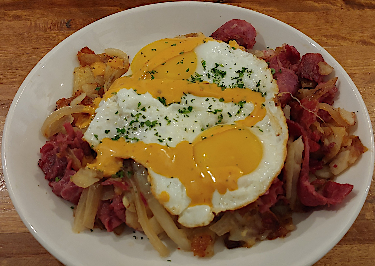 As it was, St. Patrick Day I decided to stick with something Irish: The Corned Beef Hash. This is a hash made with fried potatoes, onions, and corn beef; and is topped with two eggs any style and hollandaise sauce. I ordered my eggs sunny side up and they were perfect sunny side up eggs: nice and runny. I was also surprised at how fresh the potatoes tasted. There was plenty of food. I could easily have split it into two meals. All in all, it was excellent.