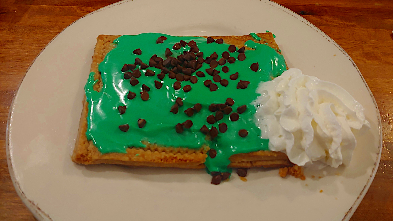 RoosTarts come in various flavors. Standard offerings are Mixed Berry or Brown Sugar. For St. Patrick Day they had a Shamrock RoosTart.
