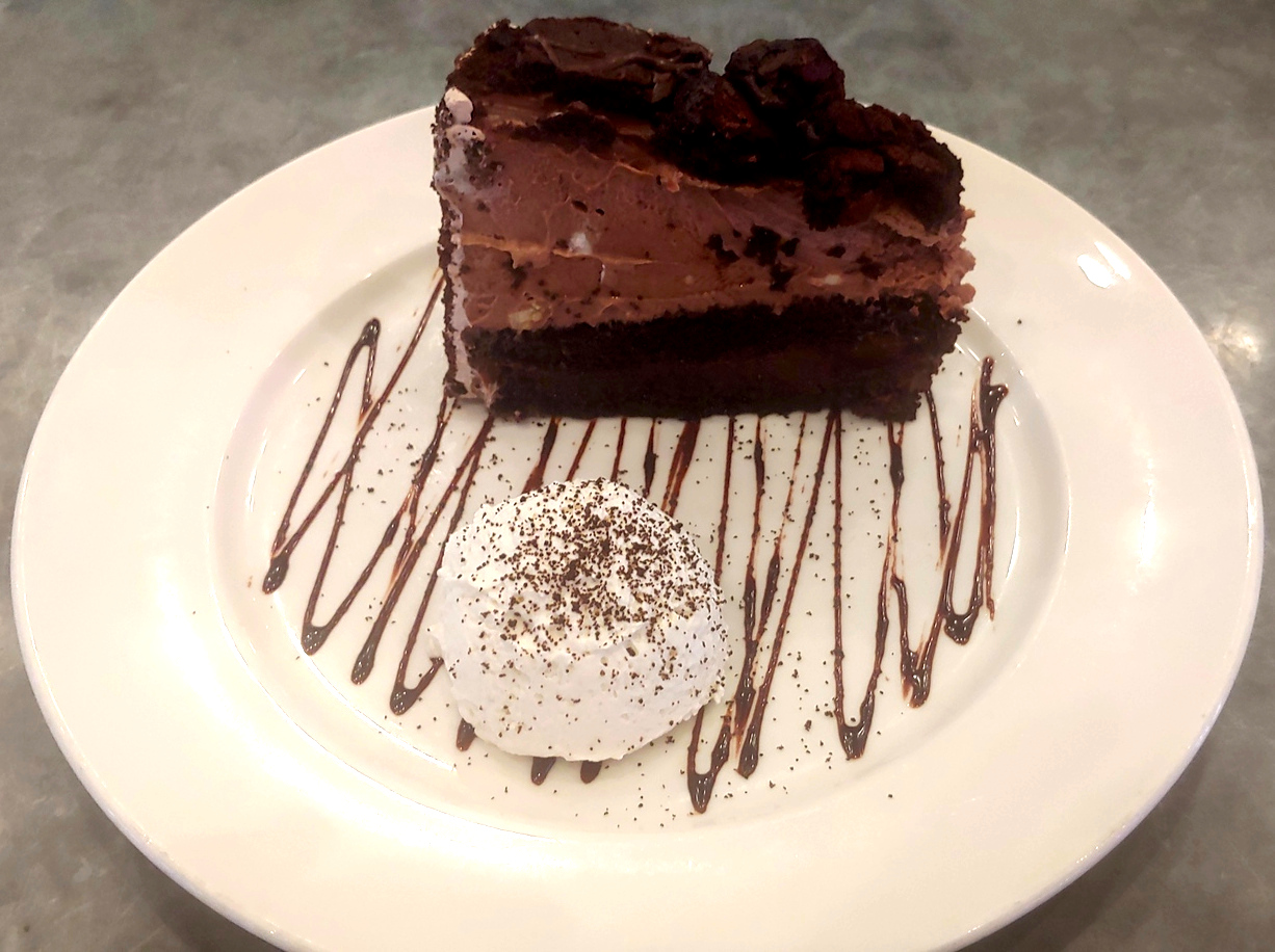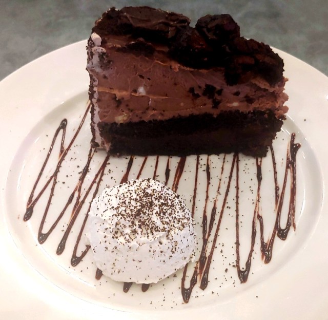 Jimmy’s has a decent sized dessert menu that includes cakes, milk shakes, and specialty items such as Creme Brulee, Waffles, Ice Cream, and Praline Brookie. There is also a dessert sampler that has Tiramisu, Banana Pudding, and a seasonal dessert. I focused on the cakes. 5 kinds are available, including Maryland’s State dessert the Smith Island Cake. However, I chose the Chocolate Blackout Cake. This is a dense chocolate cake layered with chocolate mouse and topped with chocolate ganache and bits of brownies. It was moist and flavorful, and was so fresh it tasted like it was just made. Delicious!