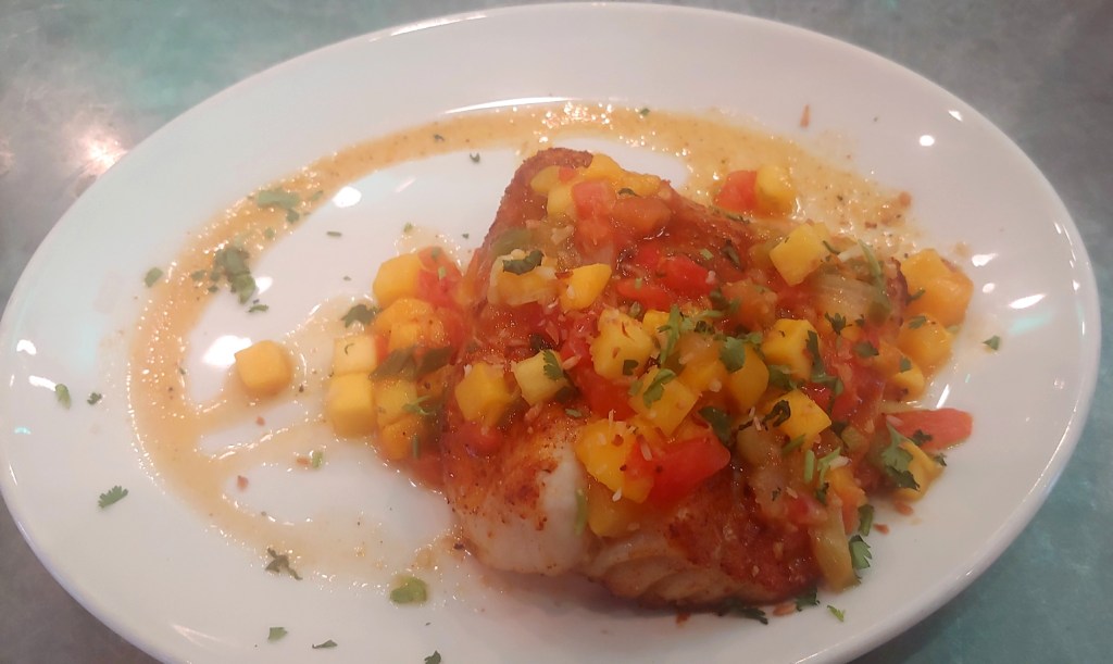I decided on getting the Grouper, Caribbean style. For my side, I chose the Charred Broccolini. The fish was cooked to perfection: moist and flaky. The mango salsa on top complemented it well, providing a hint of fruitiness to the mild fish. The Broccolini was also expertly prepared. Crisp but tender, and covered with a garlicky butter sauce. Both were great.