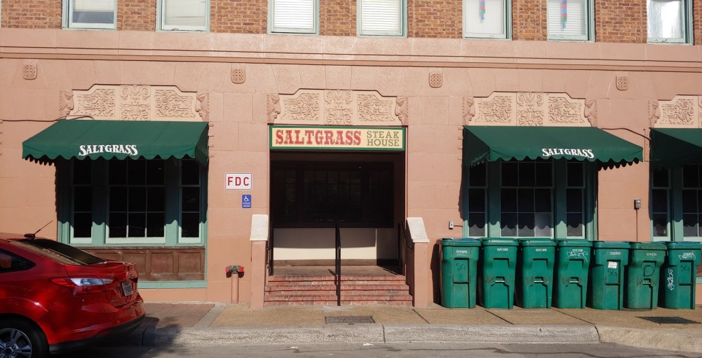 The menu describes the origin of the name. In the mid 1800s, “when millions of Longhorns roamed freely in Texas,” the cattle were driven to the Texas Gulf Coast to graze on the salt grass. The trail to and from the coast was known as the Salt Grass Trail and was renowned for having the best beef around. The Saltgrass Steak House aims to capture the high quality of that beef.