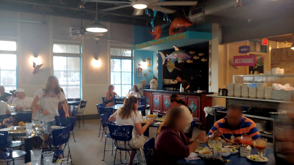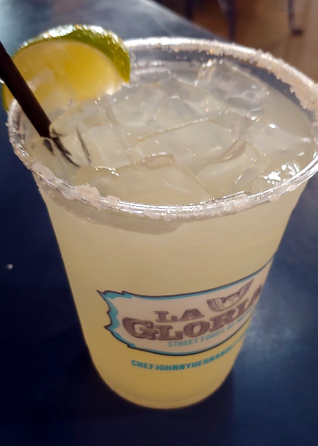 La Gloria’s has a very laid back, casual atmosphere. There is a fair amount of indoor seating and an even larger amount of outdoor seating. The outdoor seating has good views of the river. As we were there on a humid summer day, most people were eating indoors. There is a cocktail menu with a decent variety of Margaritas. The waiters were prompt and attentive. Service is fast. Extremely fast. From entering to leaving, we were able to finish our meal in under 45 minutes. However, we were not rushed at all.