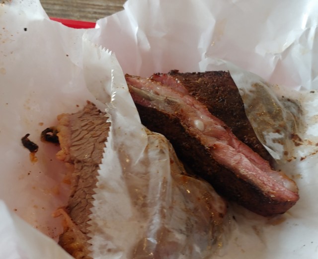 Rudy’s serves Texas style barbecue. In Texas style, you go to a butcher’s counter and order your meats by the pound. Any sides or drinks are also ordered at the counter. What’s unique about this style is that the meats can be ordered in any combination and in any size. I’ve been to “Texas style” barbecue outside of Texas, both in the States and in Europe, and there is never that flexibility. You have to order preset amounts of meat, either by itself or in set combinations. Not in Texas.
