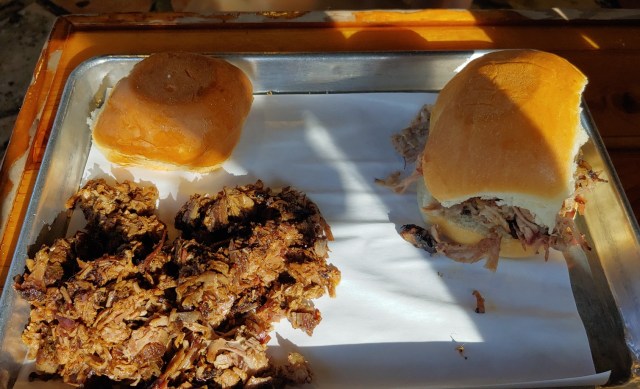 The meats on Rudy’s menu are all the classics: Brisket, Turkey, Ribs, and sausages. Standard sides include Cream Corn, Beans, Cole Slaw, and Mac-N-Cheese.