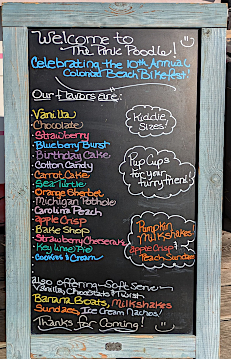 I was in King George Virginia, attending a festival on a warm fall day. Afterwards, I was in the mood for some local ice cream. There was such a place in nearby Colonial Beach, Virginia, an historic beach town situated on the Potomac River. Located near the boardwalk area, covered with bright colors, The Pink Poodle can’t be missed.