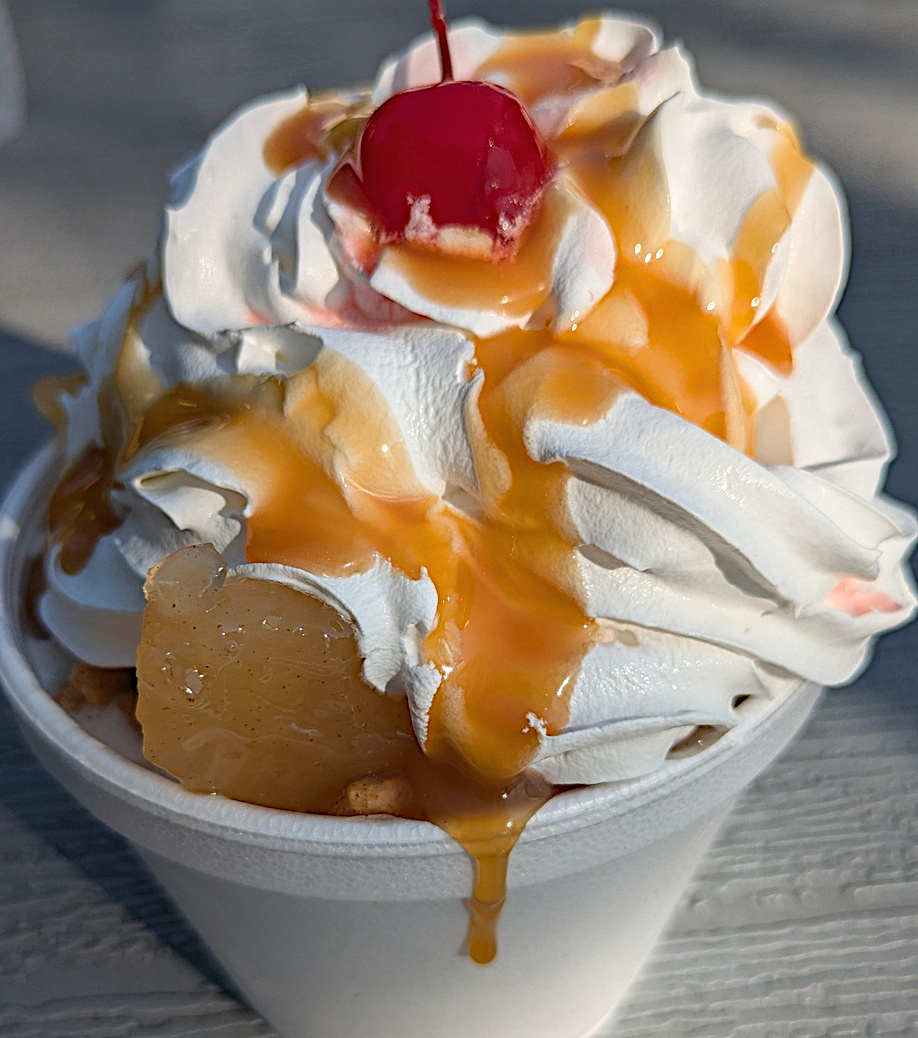 I decided to get one of the specials: an Apple Crisp Peach Sundae. The sundae is served in a large cup and consists of soft serve ice cream mixed with peaches, apples, and some sort of short bread which gives it a bit of crunch. On top is whipped cream, caramel sauce, and a cherry. It’s a great combination of textures and flavors. I can see why the Pink Poodle is well regarded (and why Nancy’s is missed), as the soft serve is first rate. The ice cream is smooth, creamy and sweet without being overpowering. The whipped cream is a non-diary creamer (a la Cool Whip), which I do prefer to the canned stuff. My one complaint: I could have used more of the caramel sauce.