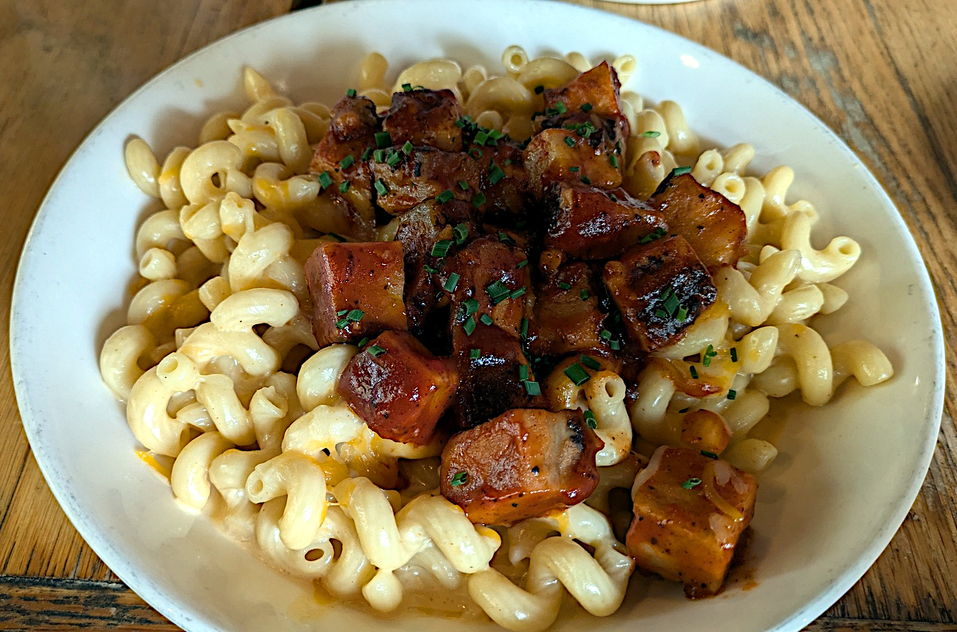 I had one of the Mac N’ Cheeses, The Pork Belly Mac. This is a Mac N Cheese with cubes of fried pork belly served on top. The pork belly is well seasoned, tender and delicious. The cheese sauce was thinner than I am used to, but it covers the macaroni and is full of cheese flavor. I liked the dish, but after the heavy appetizer I had I wish I ordered something lighter. I took most of it home, and enjoyed it for several days after.