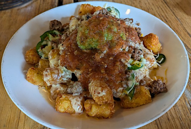 Tachos are a nachos inspired dish made with tots instead of chips. It tastes exactly they way you would expect a Tater Tot taco would. The tots are well prepared: crispy on the outside and tender on the inside. They are topped with plenty of fresh ingredients: ground beef, salsa, guacamole, shredded cheese, and sour cream. The beef harmonizes the flavors well. It is a twist on a classic that is executed to perfection.