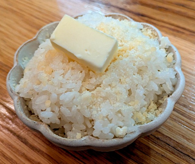 The next item to come out was a bowl of butter rice: steamed rice with a pat of butter on top. I had never seen such a dish before. It was supposed to be mixed in with the Ramen, but I had it with the left over gyoza sauce instead.