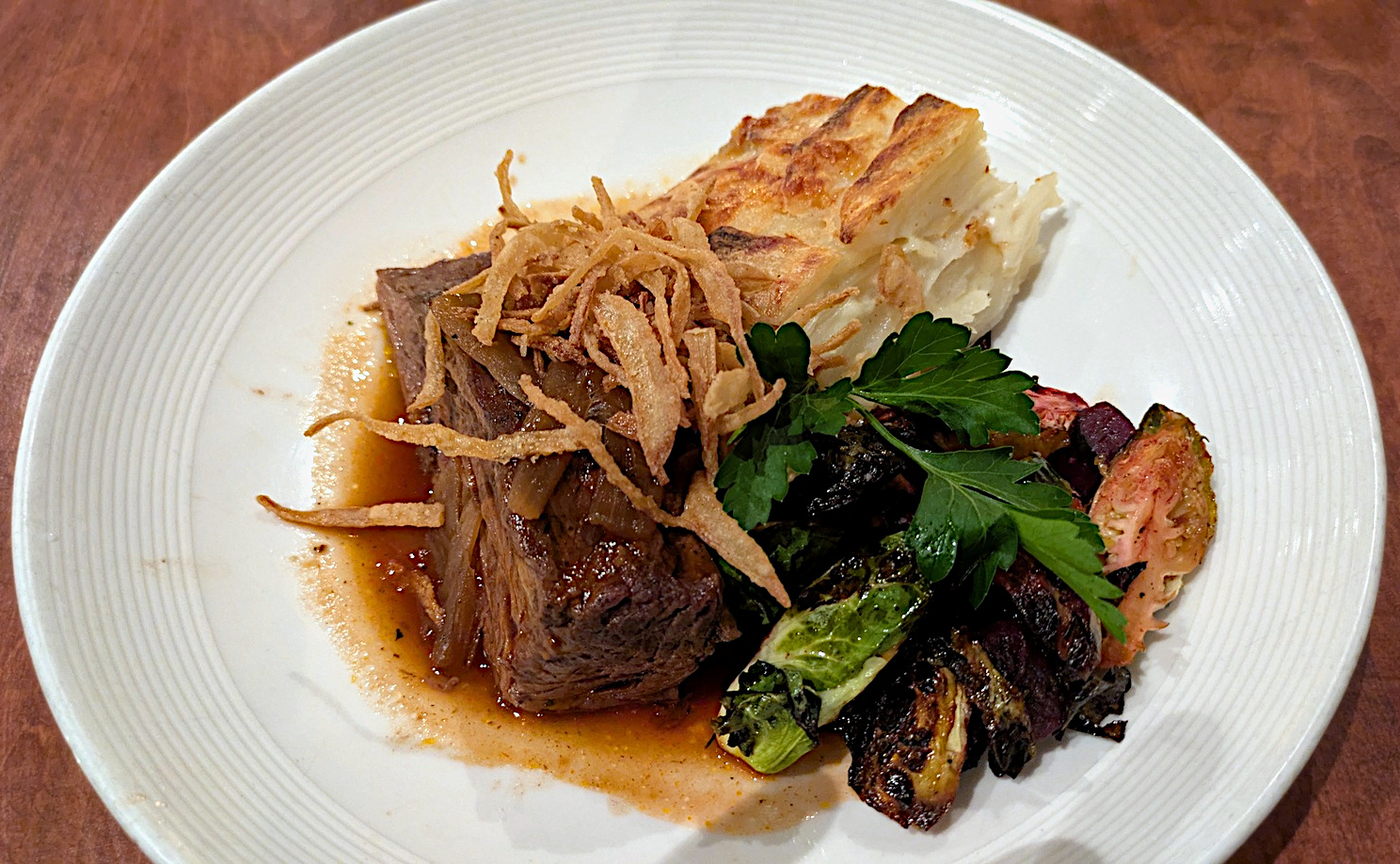 I decided on the Braised Beef Short Ribs. It was served with a Gruyere cheese potato gratin and roasted vegetables. While the short ribs were good, the sides were the stars of the dish. Gruyere cheese had a similar flavor to Swiss, giving the gratin a strong flavor. The vegetables were a mixture of Brussels sprouts and beets. Both were fresh and crisp. The beets were mild, so as to not overpower the dish. A fantastic combination.