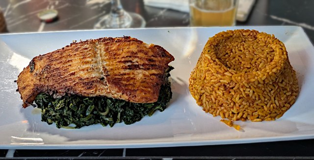 For my entree, I had intended to get Achu, which features a variety of Cameroonian dishes. But it was not available that day. On the chef’s recommendation, I ordered Ekwang Coco instead. Like Achu, Ekwang features ground Cocoyam. The main difference is that in Ekwang, the yam is wrapped in leaves (similar to grape leaves), and served with chunks of beef in a flavorful sauce. I really liked the sauce, but the cocoyams themselves were too starchy for me.