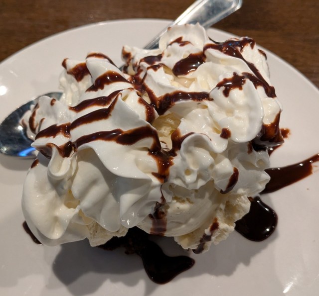 Stella Point Grille had three desserts: Funnel Fries, Brownie Sundae, and Churro Cake. I chose the Brownie Sundae. The brownie was excellent. It had a fudge like consistency and a strong chocolate taste. The ice cream was quite good as well, smooth and creamy without being overpowering. It complemented the dense brownie quite well. I did not care for the whipped cream or the chocolate sauce; both tasted commercially made and not in house. But the quality of the brownie and ice cream more than compensated for those deficiencies. I would order this again.