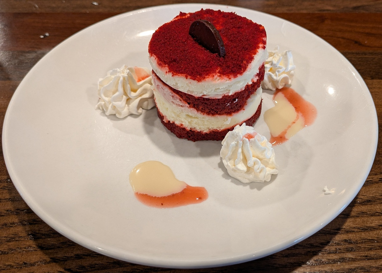 I asked for a recommendation; the waitress replied that the Red Velvet Cheesecake was her favorite, so I ordered that. I would describe It as a rich Red Velvet cake with thick layers of cream cheese frosting. I’ll also note that the whipped cream was freshly made! It was great!