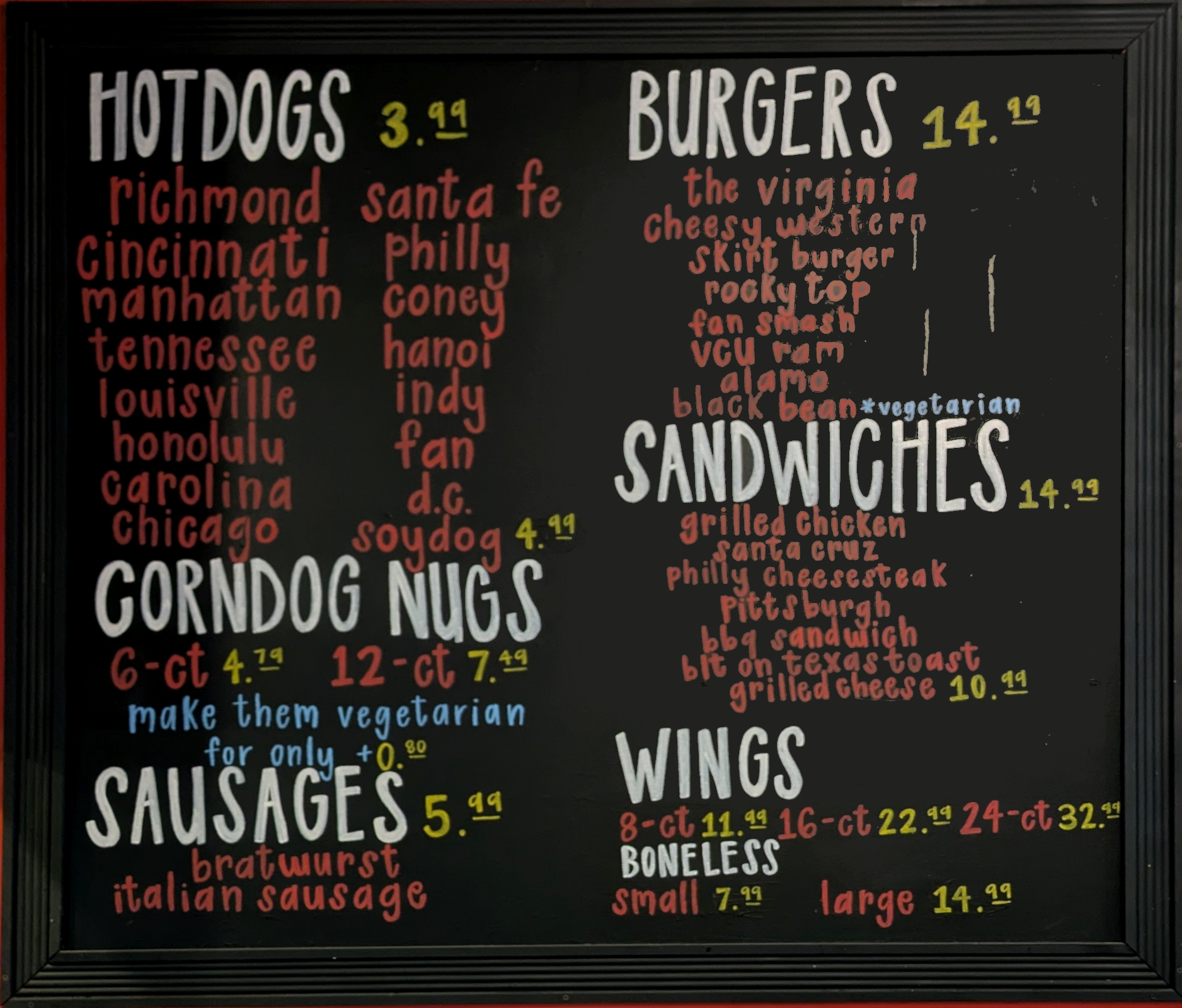 City Dogs is a sports bar and its menu reflects that. The menu consists of hot dogs, burgers, sandwiches, and wings. But the heart of the menu is hot dogs. They have 16 varieties, plus corndog nuggets and both bratwurst and Italian sausage. All the hot dogs are named after cities, from Richmond to Santa Fe, Manhattan to Honolulu, and lots of places in between (Cincinnati, Chicago, Philly, etc…)
